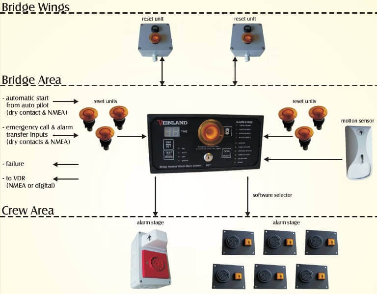 The purpose of a bridge navigational watch alarm system (BNWAS) is to monitor bridge activity and detect operator disability which could lead to marine accidents. The system monitors the awareness of the Officer of the Watch (OOW) and automatically alerts the Master or another qualified OOW if for any reason the OOW becomes incapable of performing the OOW’s duties.