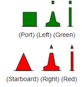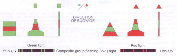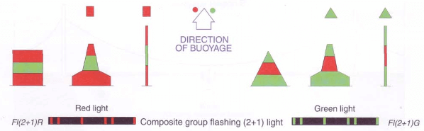 • Starboard marks are green and may have a green flashing light of any rhythm other than composite group flashing (2+1)