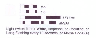 • Optionally, its distinctive sequence of flashing light, which consists of a sequence of quick or very quick flashes whose number gives the clockface position which corresponds to the direction of the cardinal (e.g. three for an east cardinal, nine for a west; north has continuous flashes, and south may be augmented with a long flash, to help distinguish it from a west in difficult conditions)