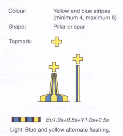 • Its distinctive pattern of black and yellow stripes, which follows the orientation of the cones – the black stripe is in the position pointed to by the cones (e.g. at the top for a north cardinal, in the middle for a west cardinal)