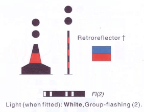 It is recognisable by its black and red bands and top-mark of two black balls. Its distinctive sequence of flashing light consists of 2 quick flashes with intervals of 5 seconds.
