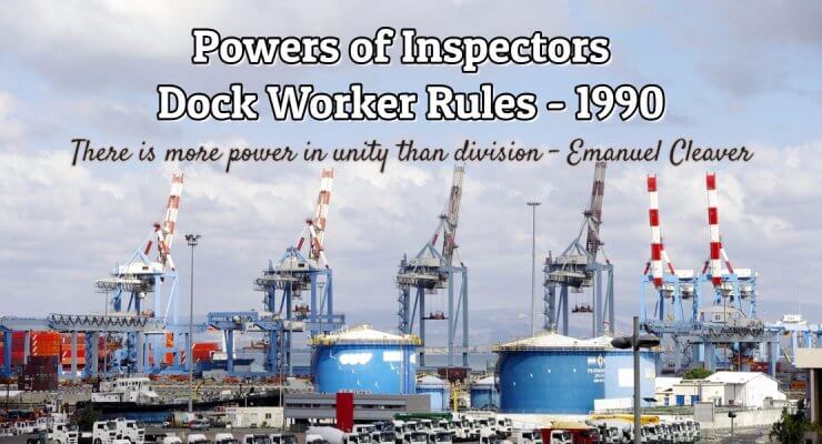 An Inspector may at any port for which he is appointed:Enter, with such assistance, (if any), as he thinks fit, any ship, dock, warehouse or other premises, where any dock work, is being carried on, or where he has reason to believe that any dock work is being carried on; Make examination of the ship, dock, lifting appliance, loose gear, lifting device, staging, transport equipment, warehouse or other premises, used or to be used, for any dock work; Require the production of any testing muster roll or other document relating to the employment of dock workers and examine such … [Read more...]