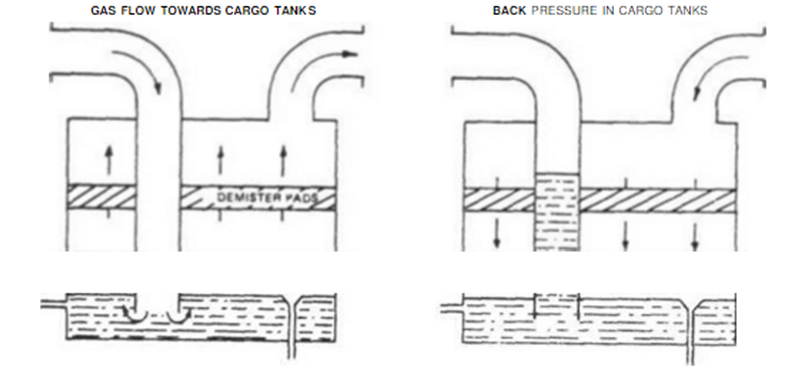 This is the simplest type of water seal. When the inert gas plant is operating, the gas bubbles through the water from the submerged inert gas inlet pipe, but if the tank pressure exceeds the pressure in the inert gas inlet line the water is pressed up into this inlet pipe and thus prevents backflow. The drawback of this type of water seal is that water droplets may be carried over with the inert gas which, although it docs not impair the quality of the inert gas, could increase corrosion. A demister should, therefore, be fitted in tlie gas outlet from the water seal to reduce any carry-over.
