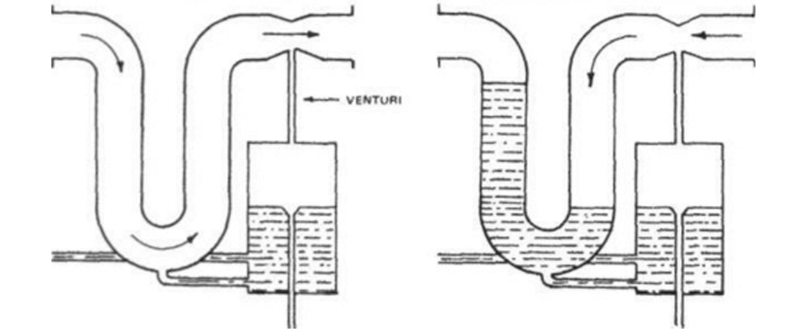Instead of bubbling through the water trap the inert gas flow draws the sealing water into a separate holding chamber by venturi action thus avoiding or at least reducing the amount of water droplets being carried over. Otherwise it is functionally the same as wet type.
