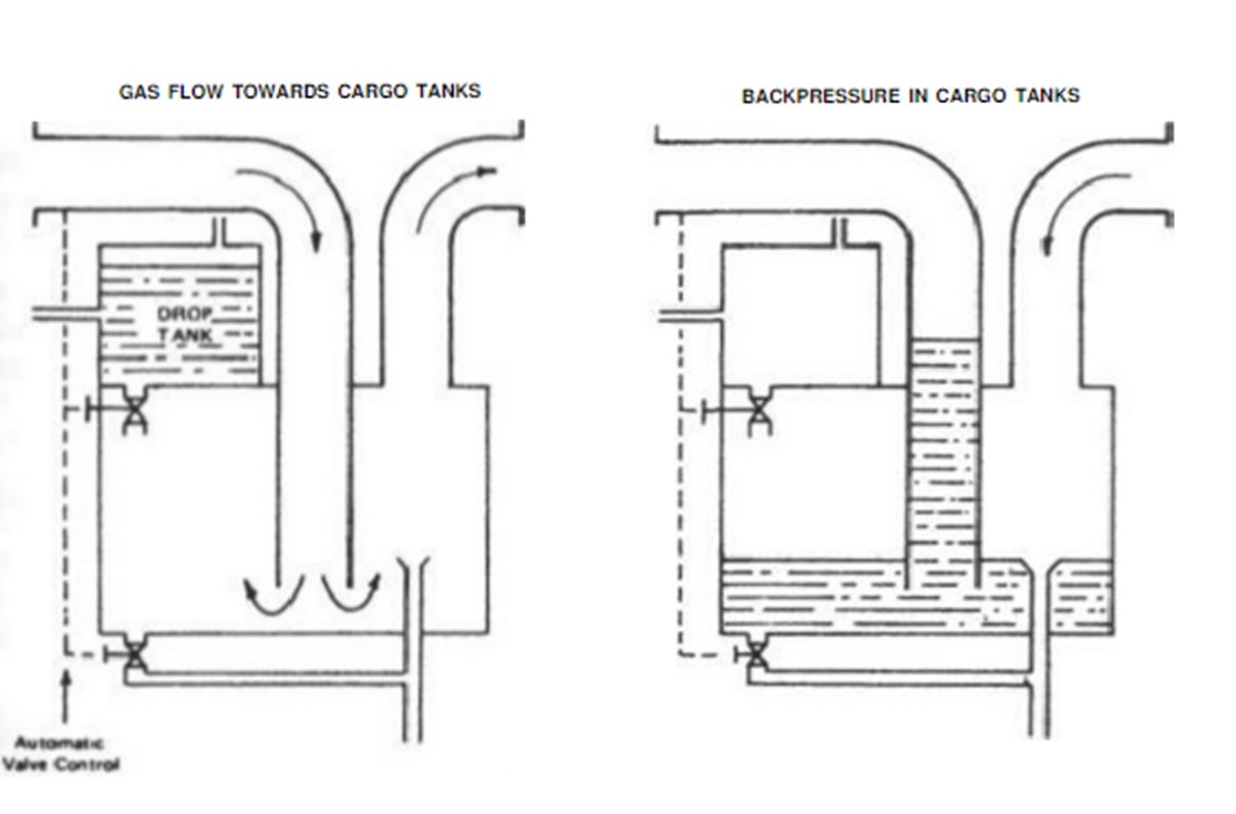 In this type the water is drained when the inert gas plant is in operation (gas flowing to the tanks) and filled with water when the inert gas plant is either shut down or the tank pressure exceeds the inert gas blower discharge pressure. Filling and drainage are performed by automatically operated valves controlled by the levels in the water seal and drop tanks and by the operating slate of the blowers. The advantage of this type is that water carry-over is prevented. The drawback could be the risk of failure of the automatically controlled valves which may render the water seal ineffective.