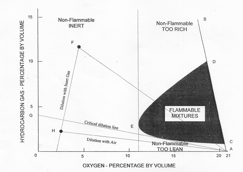 Any point in the diagram represents mixtures of hydrocarbon gas, air and inert gas, specified in terms of hydrocarbon gas and oxygen contents. As inert gas is added to the hydrocarbon gas/air mixture, the flammable range decreases until a point, represented by E, is reached where LFL and UFL coincide. This point corresponds to an oxygen content of approximately 11%. For practical purposes and to allow a safety margin, 8% is taken as the level of oxygen at which no hydrocarbon gas/air mixture can burn under any circumstances.